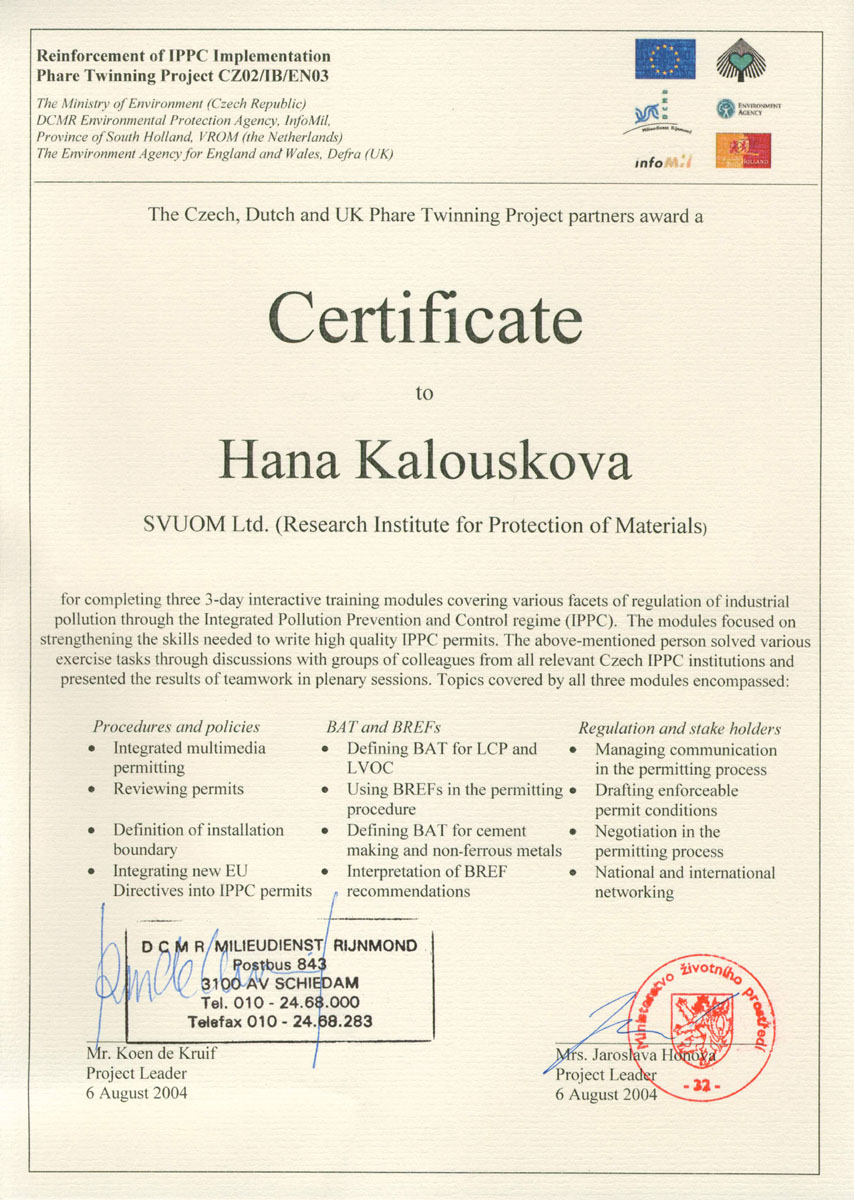 - zpracování žádostí pro integrované povolení podle vyhlášky č. 554/2002 Sb.