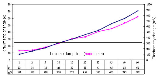 The chart is a comparison measure the effectiveness of hydrophobization concrete by gravimetric and electrometry method, with indicating the achievement of poor quality hydrophobic impregnation of concrete: electrometry observed marginal limit is 300 mV and measuring time 90 minutes.